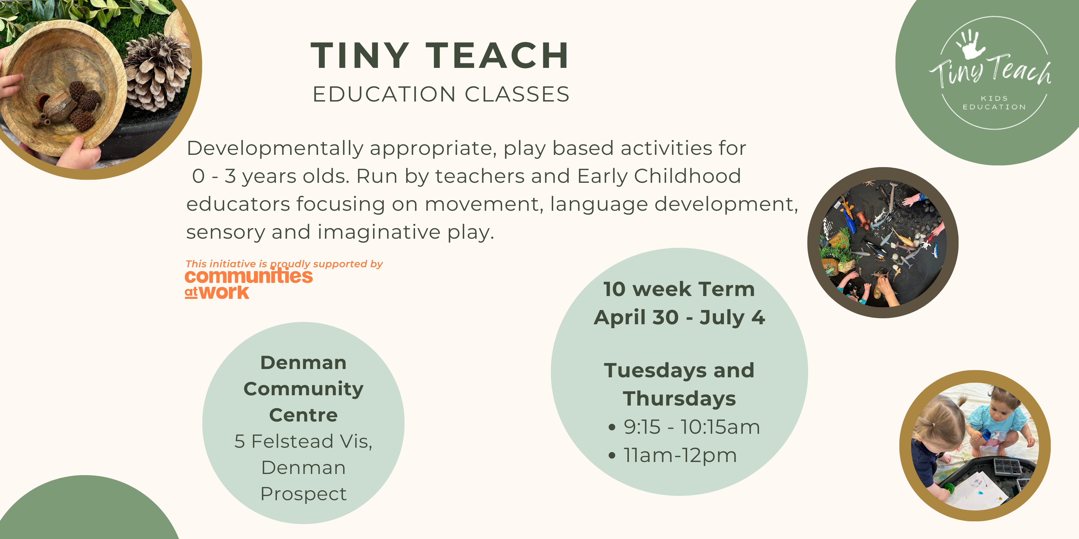 Tiny Teach, with the support of Denman Village Community Centre and Communities at Work will be running play based Educational classes for babies and toddlers. Organised activities will be developmentally appropriate, run by teachers and Early Childhood educators focusing on movement, language development, sensory and imaginative play. All classes encourage parents to be actively involved and connect with their child, as well as ask questions and engage with organisers and other attendees.